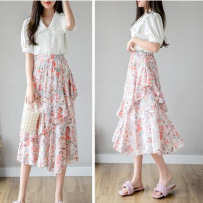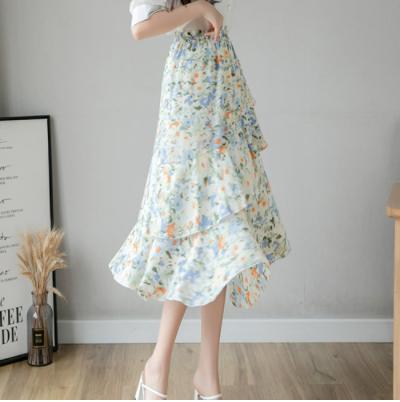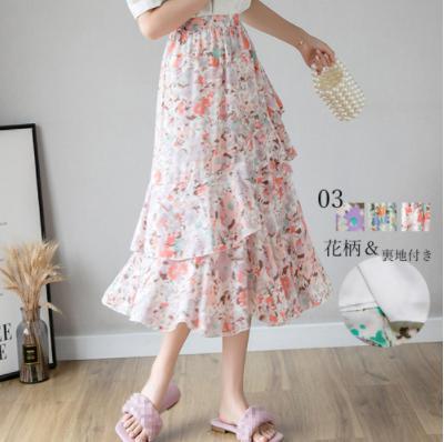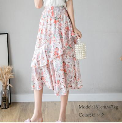 フラワー柄がコーデのアクセント、ミモレ丈で幅広い身長の方に