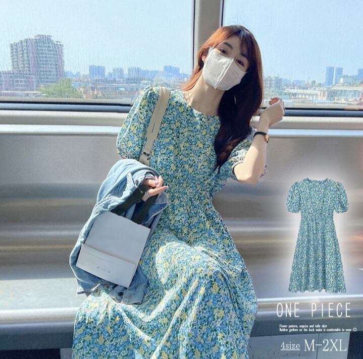 大人可愛い リゾートワンピース クルーネック 総柄 パフスリーブ 半袖 サマーワンピ フラワー柄 体型カバー きれいめ