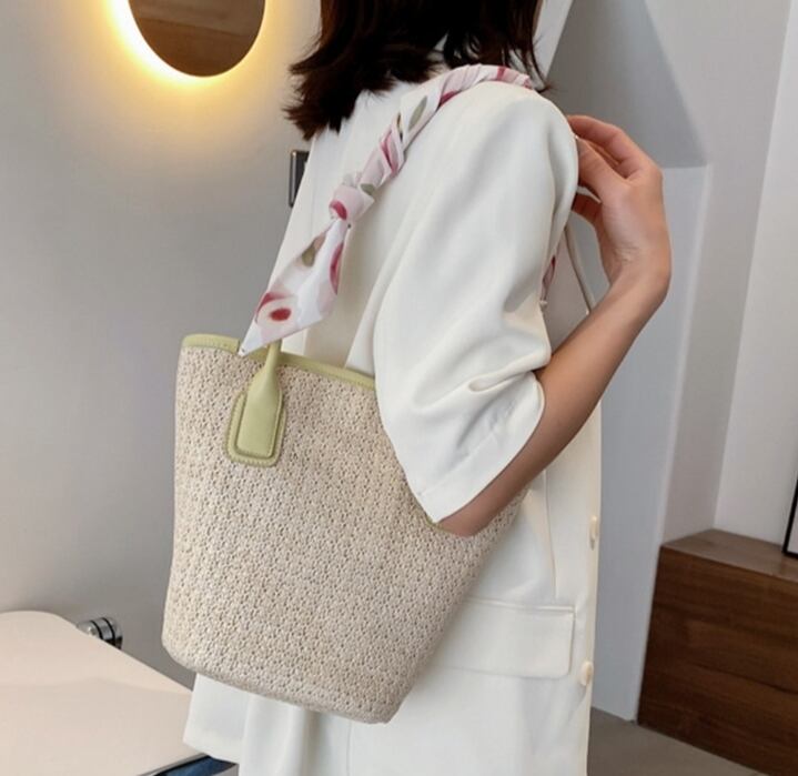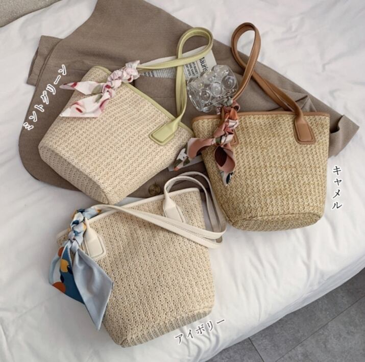 かごバッグスカーフ付きストローバッグ