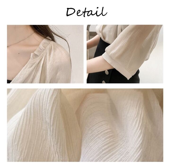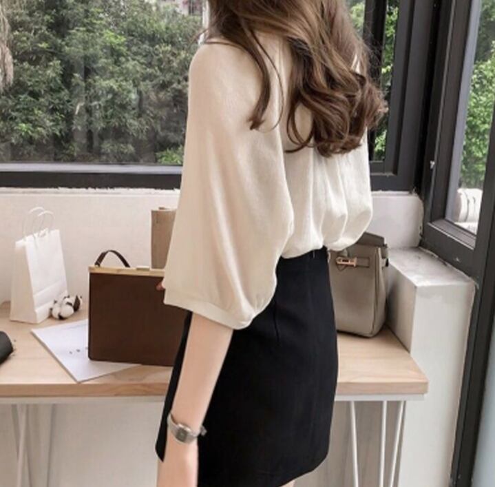 すっきりとしたVネックで、抜け感のあるシルエットを演出してくれるブラウス