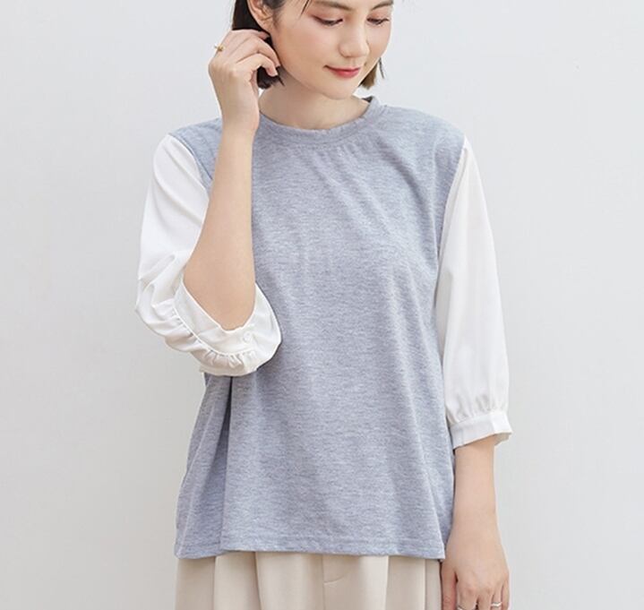 ゆるっとした異素材を切り替えたボリューム袖トップスです