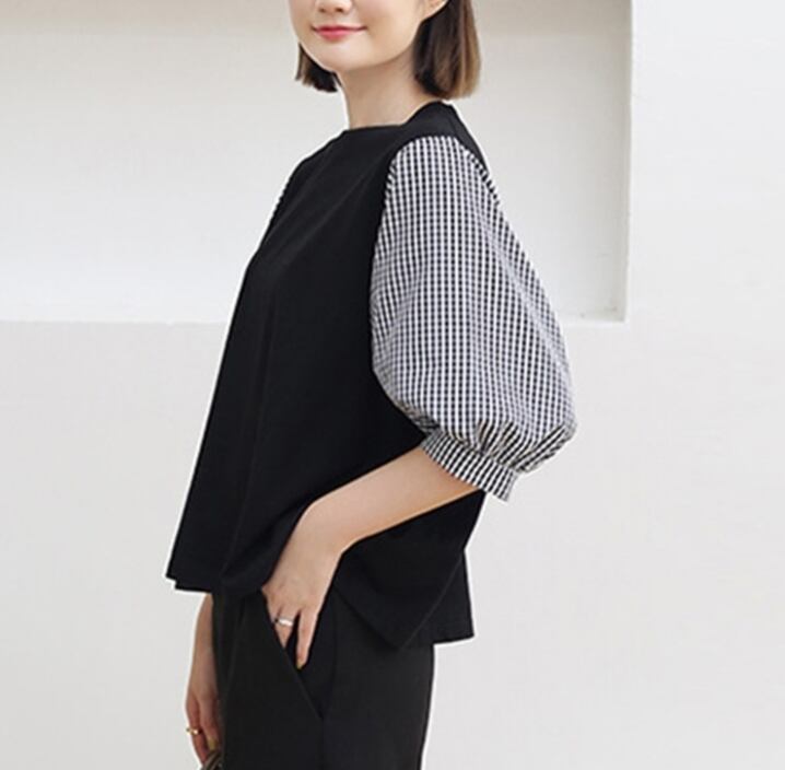 5分袖 Tシャツ 切替 レディース ゆったり チェック柄 異素材ボリューム袖 プルオーバー 大人フェミニン カジュアル