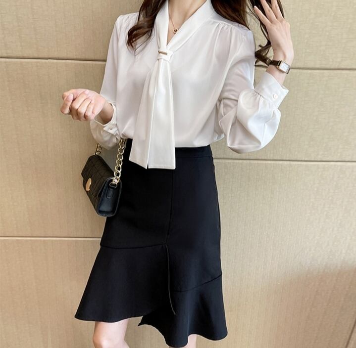 韓国風 上品 スカーフタイ トップス 長袖 とろみシャツ 白 春 シャツブラウス オフィスカジュアル ブラウス フェミニン