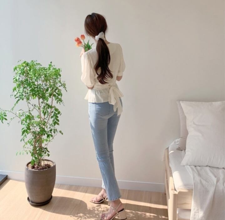 ウエストベルト レディース おしゃれ フリル トップス 春夏 きれいめ 夏服 韓国 上品 清楚 ブラウス 5分袖 フェミニンブラウス 女性30代デート服