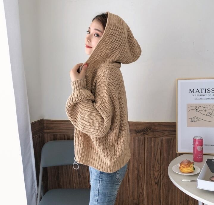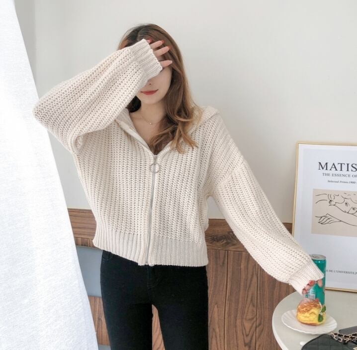 ・着回しのきく飽きのこないデザインのニットパーカートップス。